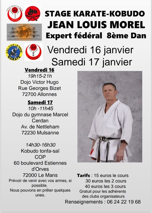 Ces stages sont gratuits pour les adhérents des clubs organisateurs d'Allonne, Moncé-en-Bellin, Mulsanne et ASL-COP Karaté.